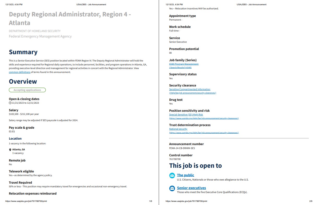 This is a Senior Executive Service (SES) position located within FEMA Region IV. The Deputy Regional Manager will hold the skills and experience required for Regional daily operations, to include personnel, facilities, and program operations in Atlanta, GA, providing executive-level direction and management for regional activities in concert with the Regional Administrator. View common definitions of terms found in this announcement.