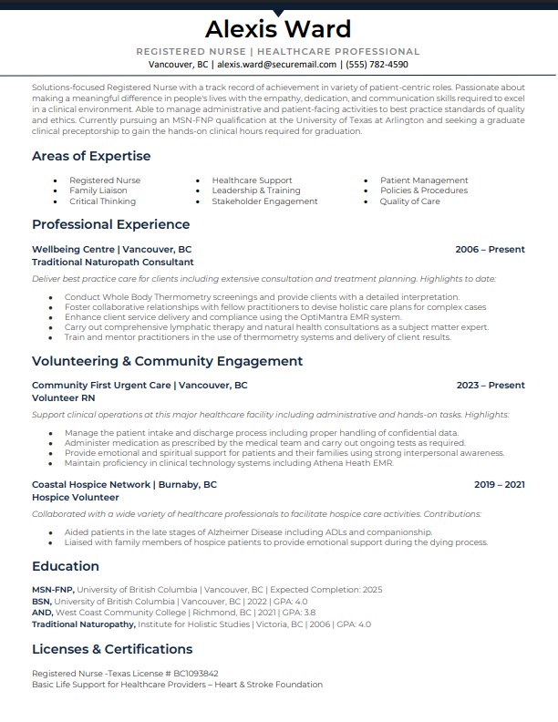 If you’re a registered nurse with diverse hands-on and community experience, and you’re preparing to move up, specialize, or secure a clinical preceptorship, this guide is for you. Alexis Ward’s resume proves you can blend empathy, versatility, and ambition into a powerful application. Here’s how to make your own story shine:
